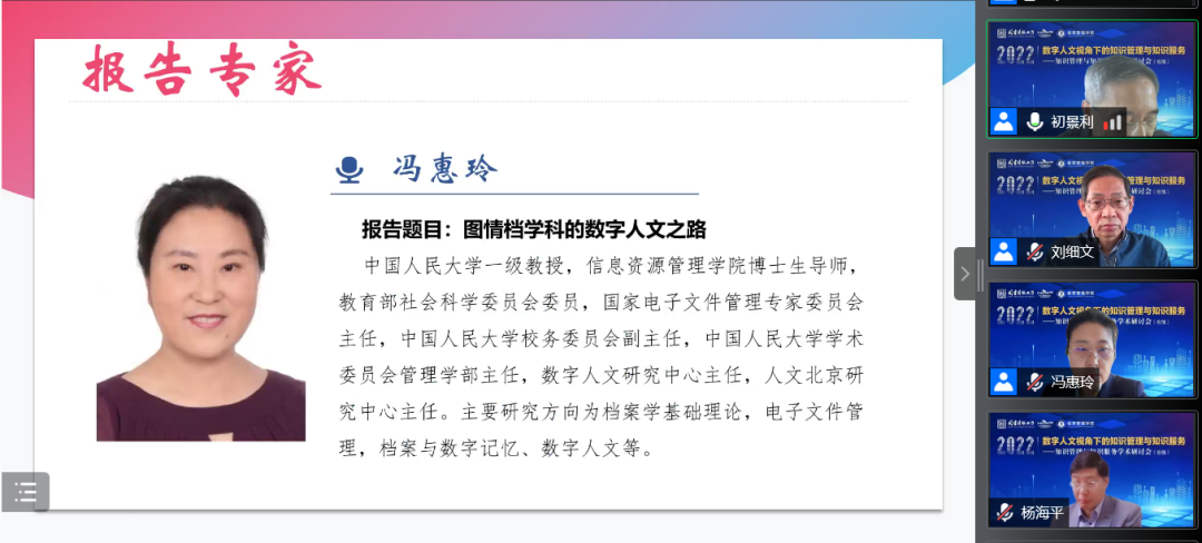 下午专家报告第一部分由中国科学院大学经济与管理学院党委书记、图书情报与档案管理系副主任、《知识管理论坛》副主编张玲玲教授主持,第二部分由《图书情报工作》《知识管理论坛》两刊编辑部主任杜杏叶主持。武汉大学信息管理学院副院长王晓光教授做“文化遗产领域知识纲要”报告,分享了文化遗产智能计算教育部哲学社会科学实验室以及社科基金重大项目最新的研究工作,提出智慧数据的概念和针对文化遗产智慧数据规范问题的文化遗产领域知识纲要,以支撑领域本体的开发和建设,促进文化遗产领域资源关联与知识融通。广州奥凯信息咨询有限公司创始人王峻岭董事长做了“中国创新与知识产权保护2.0构想与实践”报告,从其20余年的从业经验出发,系统地分析知识产权国际国内的环境、我国自主创新与知识产权的关系,并从知识产权的内涵、主要手段、安全治理体系构建以及存在问题等方面系统地剖析了中国知识产权现状。南京农业大学社会科学处处长黄水清教授从“‘两创‘方针下的计算人文研究”的视角,梳理了对“创造性转化和创新性发展”的理解及其发展历程,基于团队研究的成果全面分析“两创”方针下计算人文的使命以及存在的问题,提出未来可以通过构建古籍知识库、开发古籍知识平台来全面提升古籍利用效能。华中师范大学信息管理学院院长李玉海教授做“智慧图书馆建设的人文思考”报告,指出智慧图书馆是图书馆发展的高级阶段,图书馆既是技术敏感型公共部门,同时也是肩负着知识传播与文化传承使命的场所,着重总结了智慧图书馆的形象文化、藏书文化与服务文化等人文要素。行者互联资深顾问秦丽做了“从2021中国知识管理数据调查报告看知识管理现状和挑战”的报告,评估组织知识体系的整体现状,详细介绍了组织已有的知识管理良好实践以及知识管理给组织带来的价值认可等方面,对未来发展进行了展望。