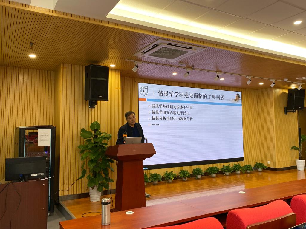 讲座伊始,曹高辉副院长介绍了杨建林教授的科研经历和学术成果,学院师生对杨建林教授百忙之中的到来表示鼓掌欢迎。之后,杨教授先对情报学中的核心概念进行辨析,在此基础上引出了情报学建设面临的主要问题。其一是情报学基础理论不够完善的问题,具体情况可分为两种:一方面是目前情报学著作中的情报学基本原理中除离散分布原理之外,其他隐藏原理、重组原理等的应用频次较低;另一方面是现有的情报学基本原理仍然存在不足,例如对部分基本原理的阐述过于简单、部分原理缺乏配套的解释、缺乏以情报为核心概念的基本原理等问题,未充分发挥这些原理对情报事业、情报业务和教育实践的解释与指导价值。其二是情报学研究内容过于泛化,杨教授表示在开展情报学研究时要具有大情报观、强调领域融合。其三是情报分析被弱化为数据分析,事实上数据分析是情报分析的基础,两者具有显著区别,杨教授也希望我们在研究中注意区分、善于运用。
