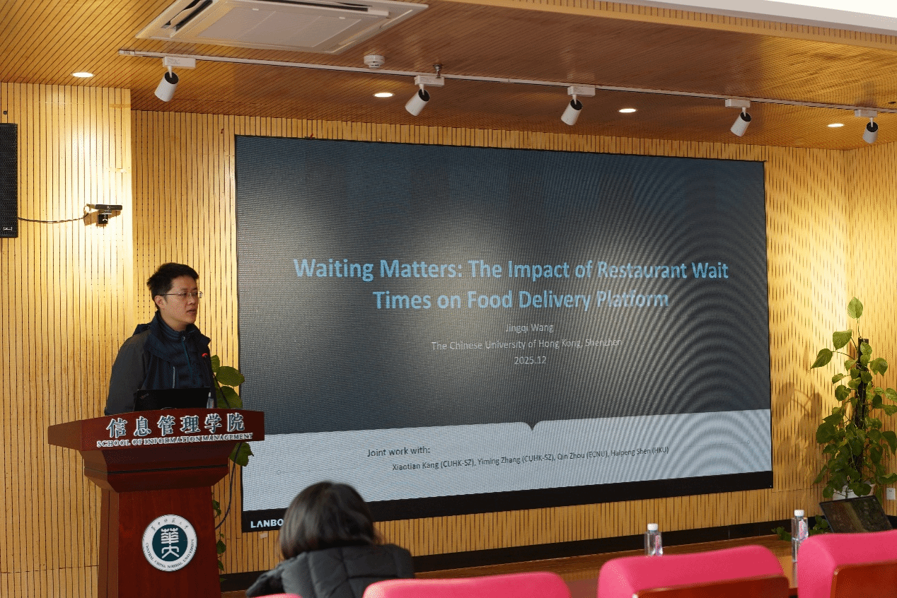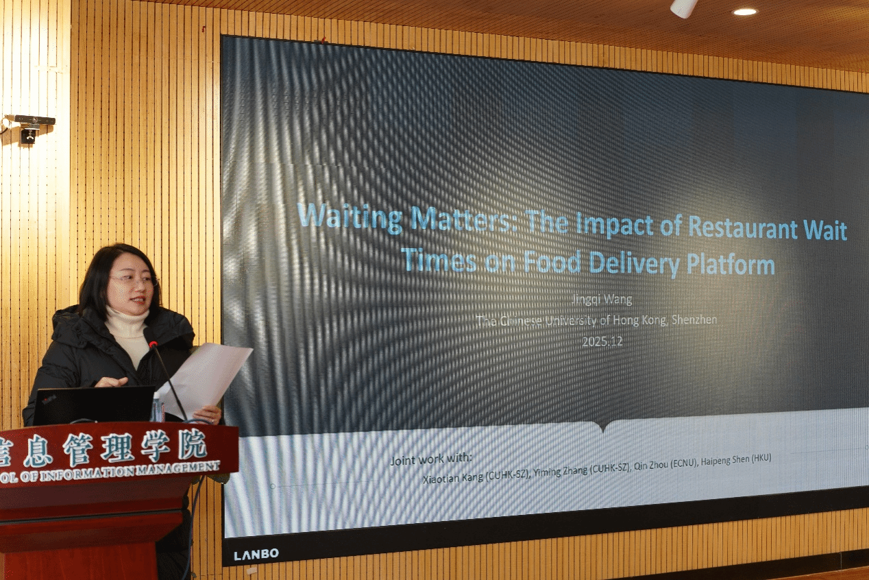 在互动环节,在场师生围绕研究内生性处理、数据获取方式、平台与餐厅的博弈机制、骑手权益保障等话题踊跃提问。王教授结合研究经验与现实观察,一一给予了细致回应。他提到,平台已在尝试动态调整预计送达时间、优化骑手考核方式,未来或可通过机制设计激励餐厅提升出餐效率,实现平台、餐厅、骑手与消费者的多方共赢。讲座尾声,王教授还简要介绍了所在学院的博士与博士后招生政策,欢迎有志于运营管理、信息系统等领域深入研究的同学加入。