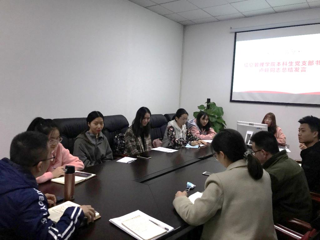 (通讯员 彭泽)2020年11月3日,中共华中师范大学信息管理学院本科生党支部10月党日活动在学院10063会议室顺利进行,活动由党支部宣传委员武晓红同志主持,党支部书记卢旺同志和支部其他党员同志参加了此次活动。