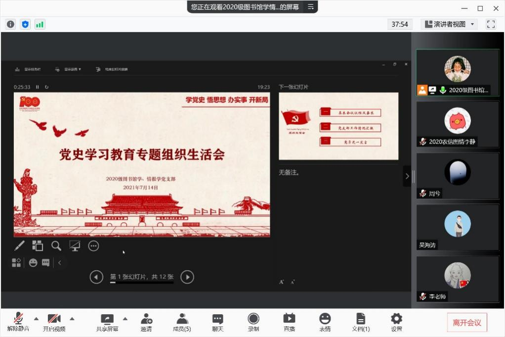 (通讯员孙艳玲)2021年7月14日晚7点,信息管理学院硕士研究生2020级图书馆学、情报学党支部在南湖综合楼10038党员活动室和线上腾讯会议室同步开展了党史学习教育专题组织生活会,活动由支部书记王妞妞同志主持,党史学习教育督导组吴海涛老师、我院分党委委员李静老师和支部全体党员参加。
