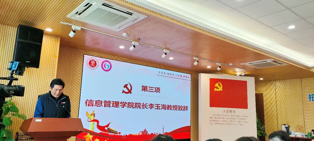 会议第三项,信息管理学院院长李玉海教授致辞。李院长代表信息管理学院全体师生对省妇幼保健院产科代表团队的到来表示热烈的欢迎。他衷心感谢肖梅主任团队,能够在寒冷的冬天把温暖的关怀和专业的妇幼保健知识送到信息管理学院,这对我院师生来说是一次难得的学习机会。李院长表示,这一次的医校联谊,是学习贯彻落实党的十九届六中全会精神的务实之举,是促进优生优育水平,响应国家生育政策走进高校教育的重要体现。他相信,双方党员定当不忘初心、牢记使命,从党的百年奋斗史中汲取走向未来的无穷智慧和强大力量,更好地服务医疗健康和教育大局,以更加昂扬的姿态,奋进推动新时代妇幼保健事业发展。