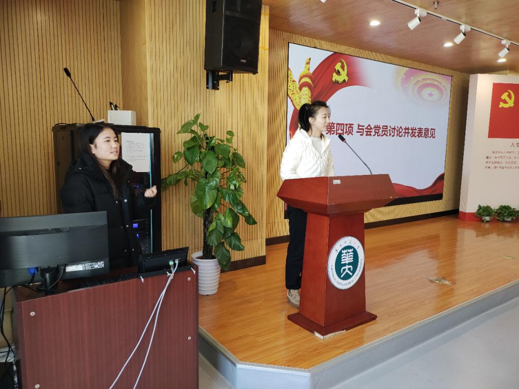 大会第一项,发展对象汇报自身情况。姚毅、杨天卓、余丽霞等同志分别从学习科研、日常生活、学生工作、社会实践等方面详细汇报了自提交入党申请书以来的表现,同时也积极展开自我批评,总结自己存在的不足,表达了向党组织靠拢的决心。朱梓芸同志表示,在之后的时间,会积极展开自我批评,发现自己的不足从而不断进步;从小事做起,严格要求自己,用行动证明自己入党的决心。倪嘉蔚同志谈及了自己学习党史、了解时事的方法,即通过不同的官媒和网站了解党的政策,从而提高思想政治觉悟。