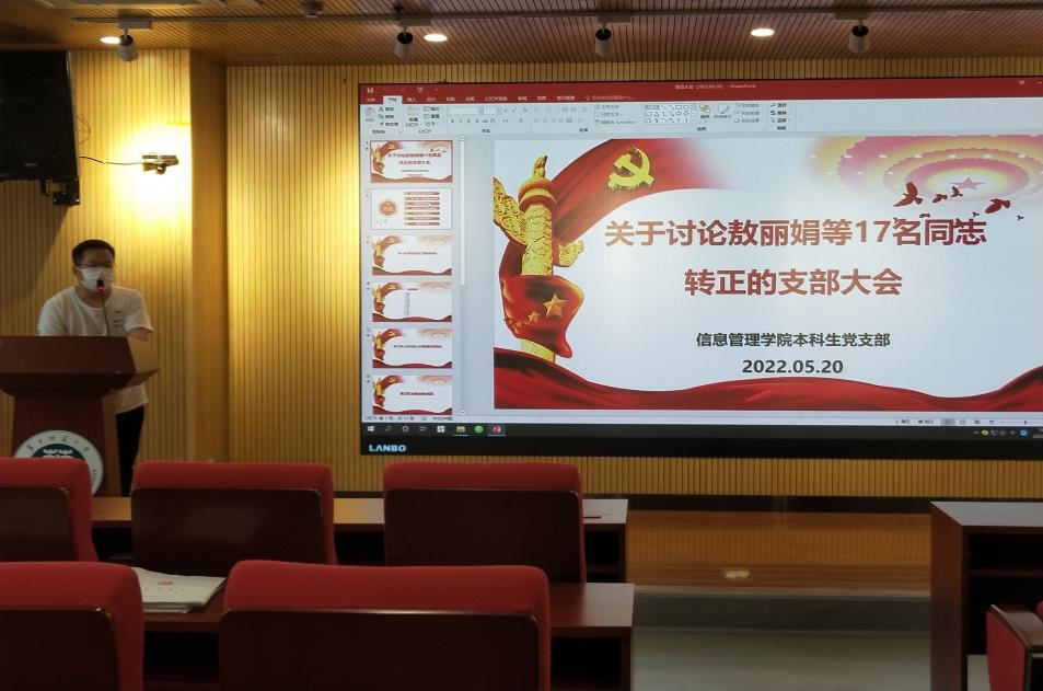 (通讯员 姚毅 敖丽娟)2022年5月20日下午,华中师范大学信息管理学院本科生党支部于南湖综合楼10001会议室顺利召开了关于讨论敖丽娟等17名预备党员转正的支部大会。本次活动由2018级辅导员卢旺同志主持,本科生党支部全体党员同志参加。