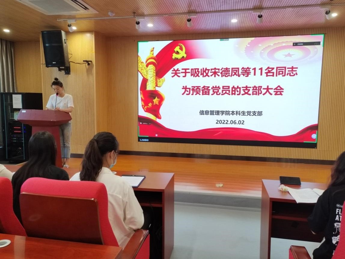 (通讯员 夏春秋 余丽霞)2022年6月2日下午,华中师范大学信息管理学院本科生党支部吸收预备党员大会在南湖综合楼10001会议室顺利召开。会议由党支部书记肖丽霞同志主持,支部全体党员参加。