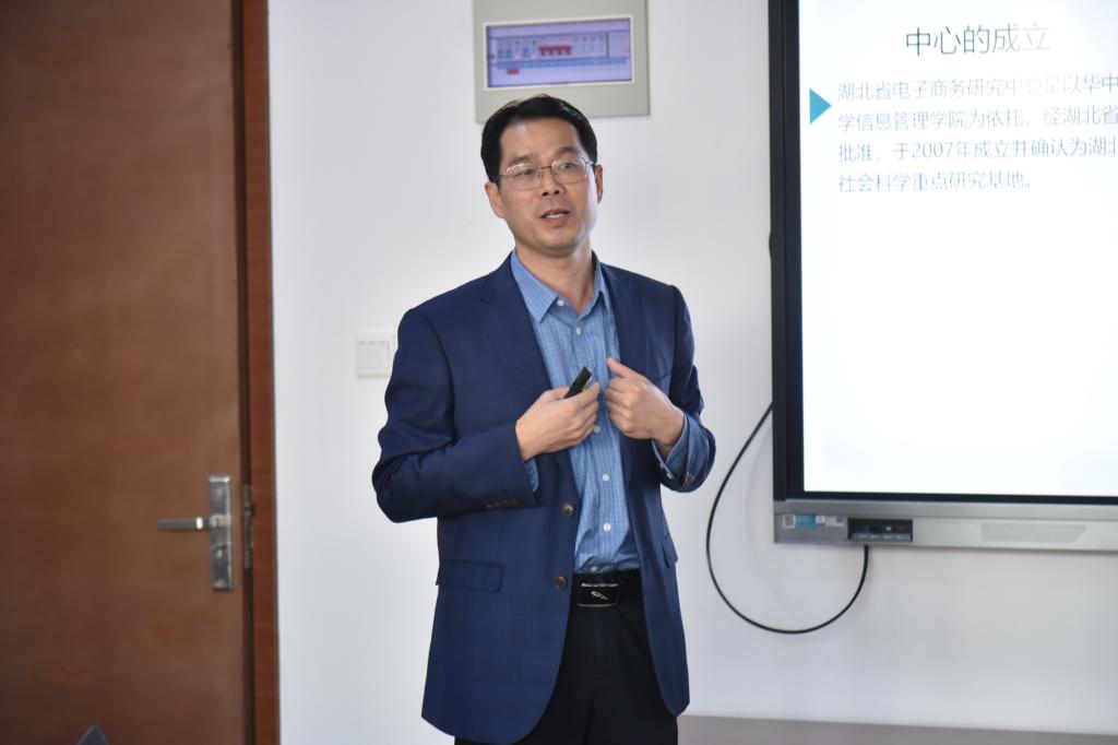 卢新元教授从中心简介、研究方向、重点工作三个方面介绍了湖北省电子商务研究中心的基本情况。他谈到,中心将争取在重点研究领域实现突破。他希望未来能与省级职能部门、各地市州加强合作与联系,发挥中心的应有作用,助推地方经济发展。