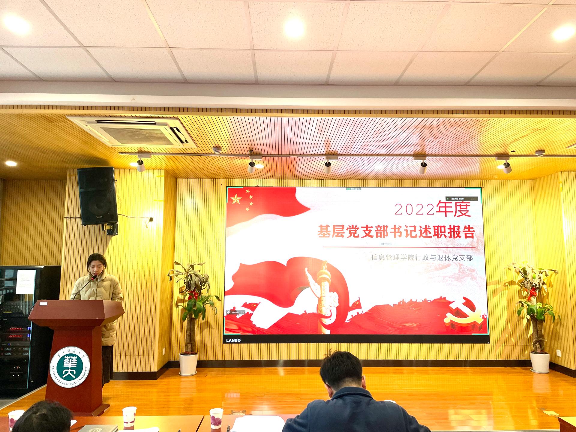 7位党支部书记就2022年度党建工作成绩与经验、存在的突出问题、今后努力方向及整改措施等方面依次进行了述职。2022年度,在学院党委的带领下,信息管理学院各党支部深入学习贯彻习近平新时代中国特色社会主义思想和党的二十大精神,深刻领悟“两个确立”的决定性意义,增强“四个意识”,坚定“四个自信”,做到“两个维护”,不断提高政治判断力、政治领悟力、政治执行力,推动学院党建工作实现新发展。