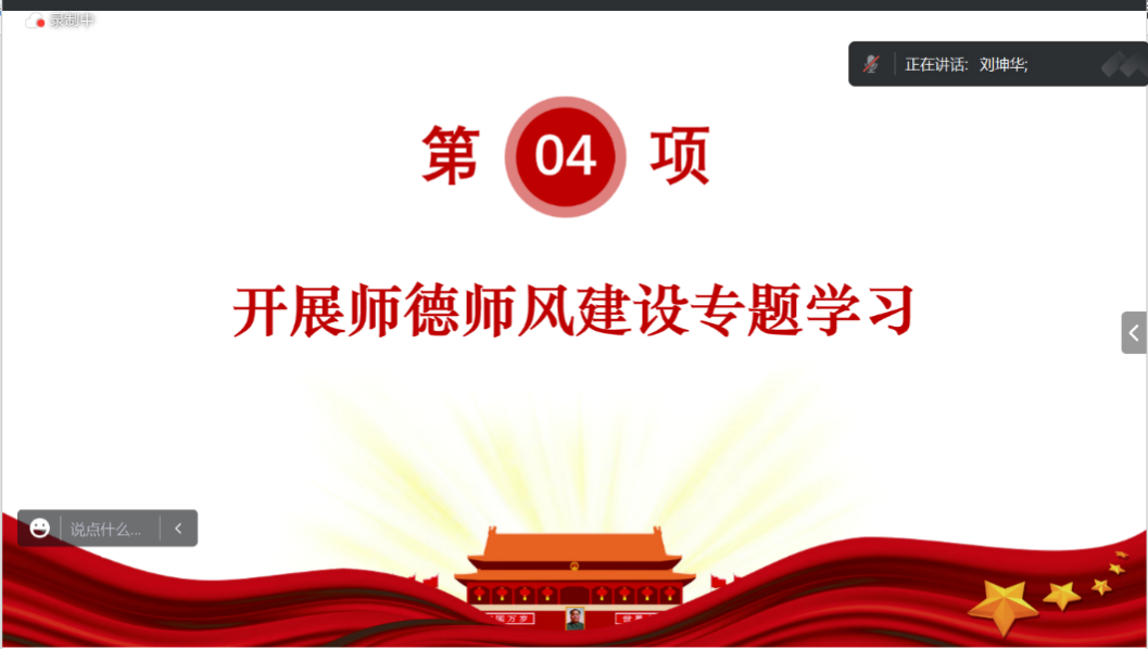 紧接着,刘坤华同志主持开展师德师风建设专题学习。党的十八大以来,习近平总书记对广大教师提出了“四有”好老师、“四个引路人”、“四个相统一”、“经师”和“人师”统一的“大先生”等殷切期望。全国广大教师要做有理想信念、有道德情操、有扎实学识、有仁爱之心的好老师,为发展具有中国特色、世界水平的现代教育,培养社会主义事业建设者和接班人作出更大贡献。
