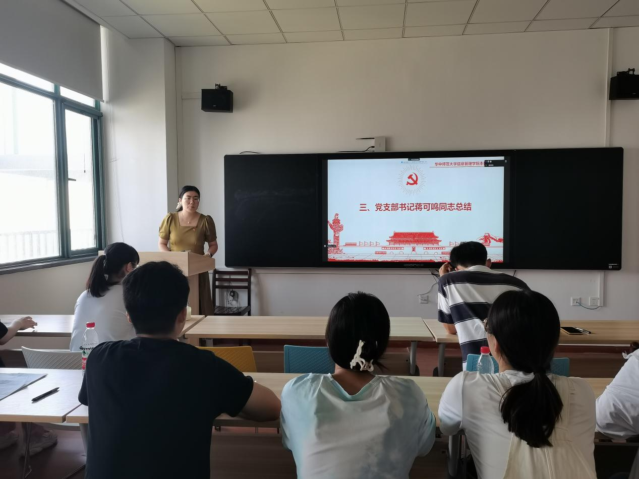 党员同志发言结束后,党支部书记蒋可鸣同志进行总结讲话。蒋可鸣首先对上学期以及开学初党支部的各项活动进行总结,查摆党支部存在的问题并提出整改措施。她希望支部各成员能够加强理论学习,成员之间互相鼓励、互相帮助,勇敢地表达自己的困惑和问题,积极调整自己的心态。党员同志要担当自己的责任,实现自己的人生价值,在勇于担当的同时,也要成为一个善于作为的人,共同推进支部建设。