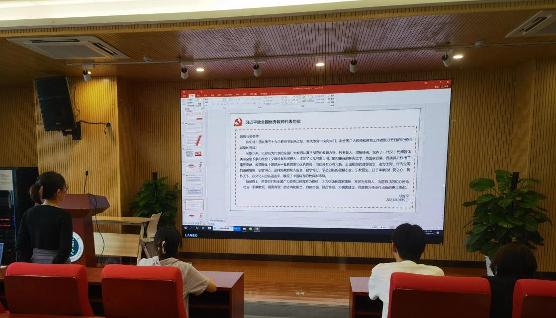 会议第三项,全体党员同志学习习近平总书记教师节重要指示精神。习近平总书记指出要大力弘扬教育家精神,培养高素质教师队伍,营造全社会尊师重教浓厚氛围,为强国建设民族复兴伟业作出新的更大贡献。刘奥同志借此呼吁各位党员同志大力弘扬教育家精神,自信自强、踔厉奋发,为强国建设、民族复兴伟业作出新的更大贡献。