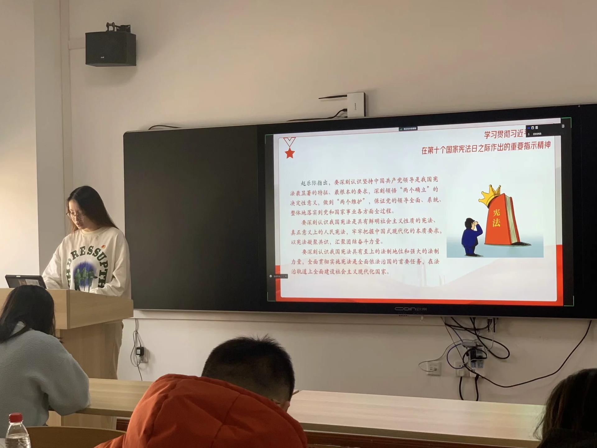 会议第四项,盛思瑶同志带领支部同志学习贯彻习近平总书记在第十个国家宪法日之际作出的重要指示精神。在第十个国家宪法日到来之际,习近平总书记作出重要指示指出,宪法是治国安邦的总章程,是我们党治国理政的根本法律依据,是国家政治和社会生活的最高法律规范。习近平总书记强调,要坚定维护宪法权威和尊严,推动宪法完善和发展,更好发挥宪法在治国理政中的重要作用。