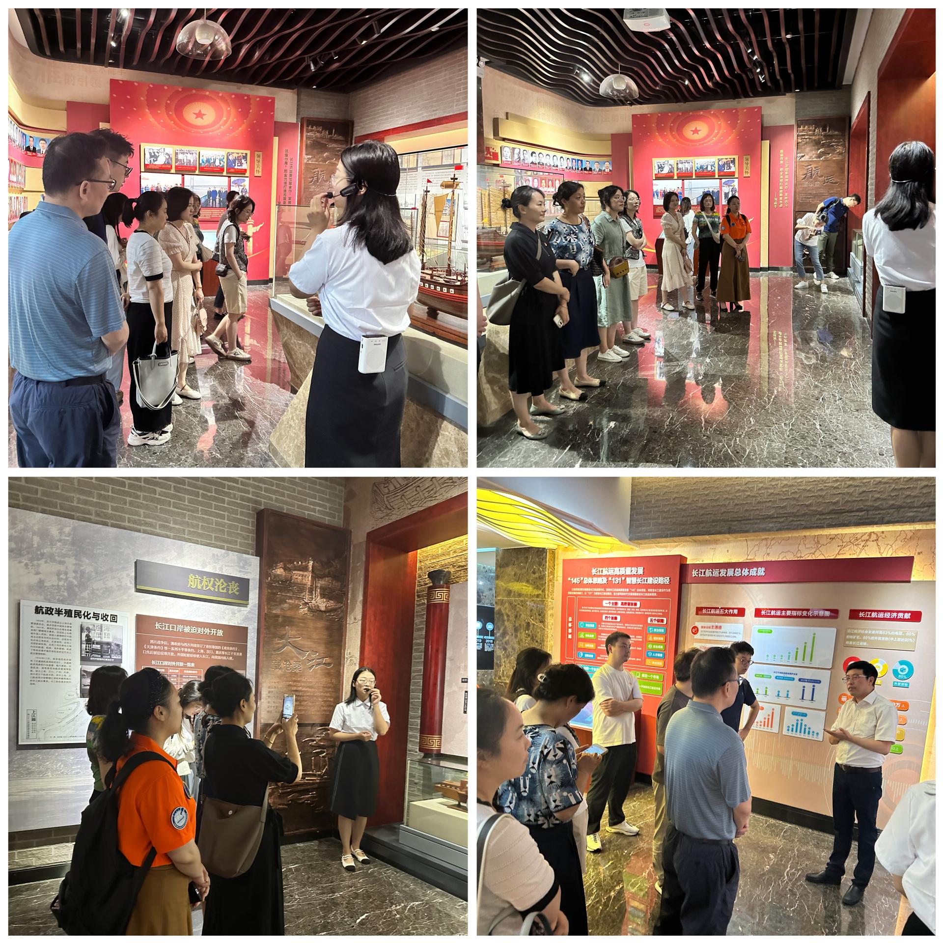 该展馆以时间为经,航运要素为纬,分为长河起帆樯、大江载沧桑、航运谱华章三个章节,通过照片、视频、文档、实物的方式展示了船舶进化史、航道改革路、航标灯演变历程。在陈列馆工作人员的带领和专业讲解下,支部党员首先观看了长江航运史宣传片。接着参观了“古代航运”展区,通过珍贵的文物和详细的图文资料,深入了解了长江航运的起源和发展。随后,大家来到“近代航运”展区,这里展示了长江航运在近代中国历史上的重要地位和作用,以及革命先烈们在航运事业中的英勇奋斗。在“现代航运”展区,大家被一幅幅生动的图片和模型所吸引,感受到了长江航运在改革开放后的飞速发展,特别是近年来,长江航运在智能化、信息化方面的显著进步,更是让教师们倍感振奋。在参观交流中,长江航务管理局殷黎书记向大家分享了自己所经历和感受的长江航运伟大发展,引发共鸣;此外,殷书记还介绍了长江航务管理局的组织架构,使大家对其管理和发展模式更加了解。