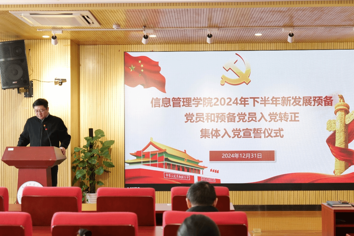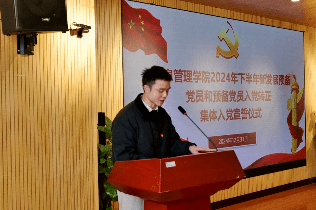 (通讯员 王睿涵)12月31日,我院于南湖综合楼10001报告厅举行2024年下半年新发展预备党员和预备党员入党转正集体入党宣誓仪式。学院党委书记王雨露、党委副书记王涛,副院长易明,教师代表、信息管理与信息系统党支部书记刘百灵,党务干事薛莲以及全体新发展预备党员和转正党员参加仪式。研究生辅导员龙伟主持仪式。