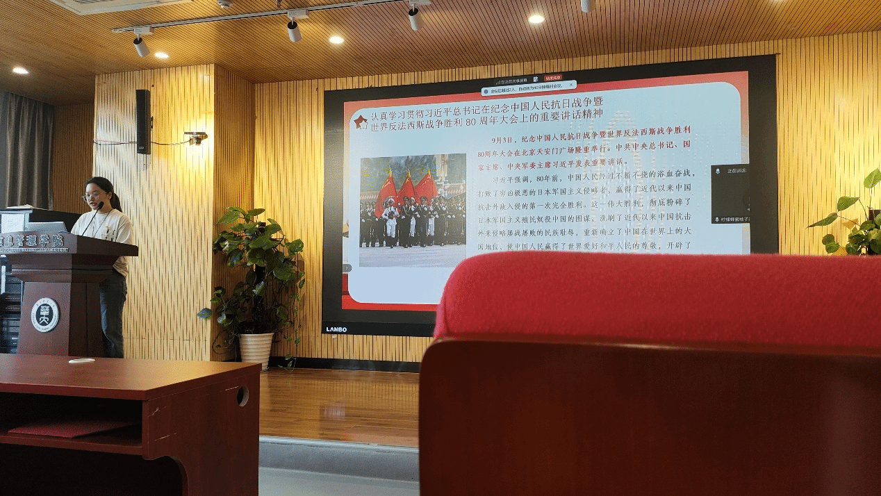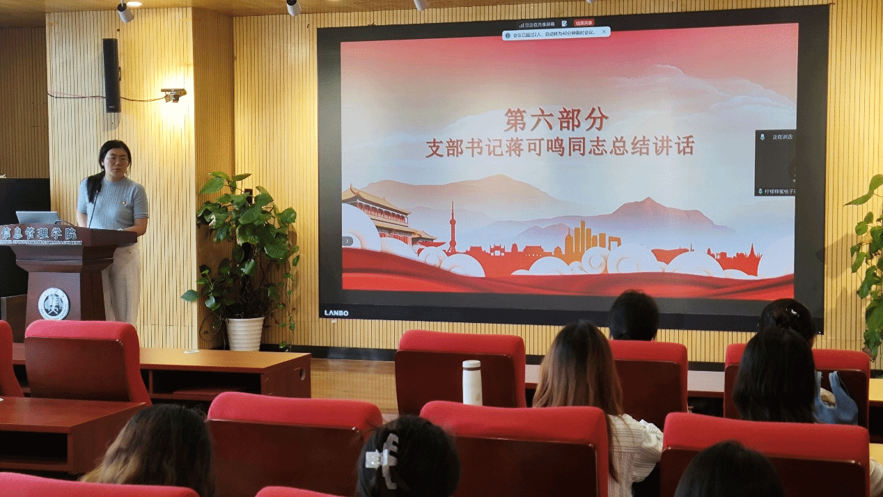会议最后,支部书记蒋可鸣同志作总结讲话。她指出,本次党日活动内容扎实、意义深远,既延续了四月、五月活动中关于纪律教育、作风建设和国家安全教育的主题,又结合当前重要时间节点深化了思想内涵。她强调,全体党员要进一步强化纪律意识、弘扬抗战精神、践行育人使命,将学习成果转化为推动学院发展和党组织建设的实际行动,以更加饱满的热情和扎实的作风投身各项工作,为学院建设和党的事业发展贡献青春力量。
