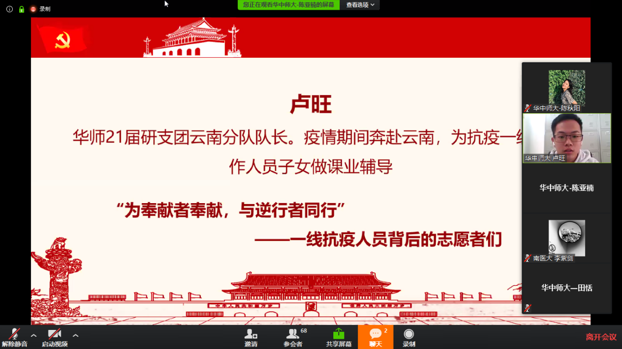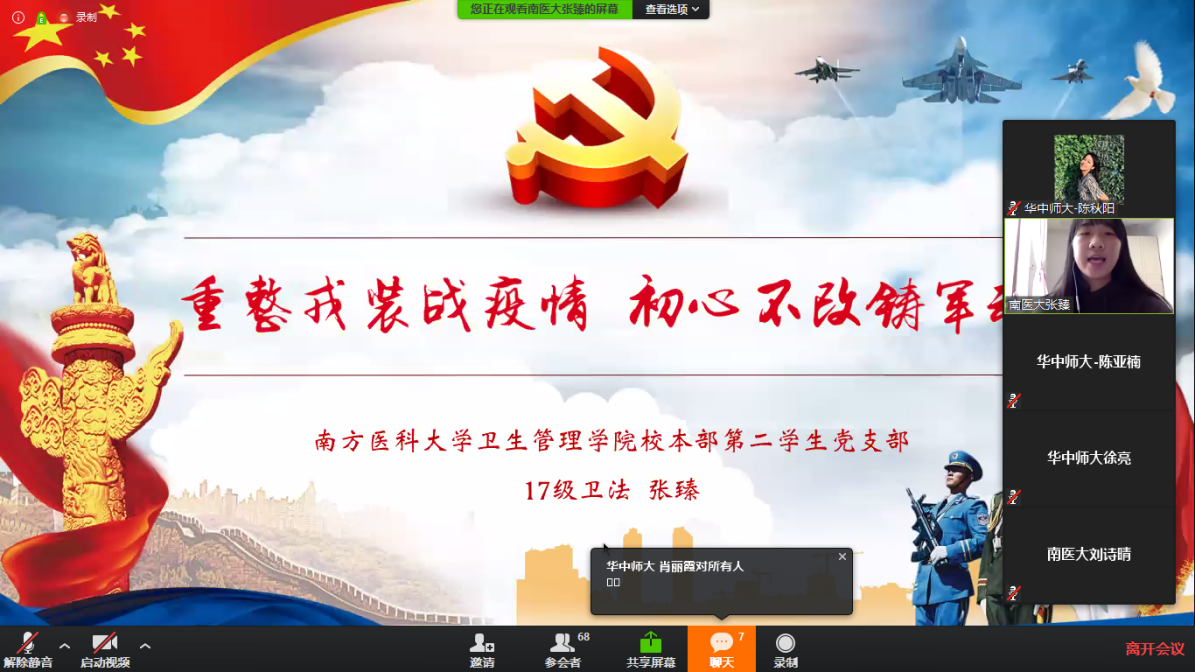 随后,双方党支部党员同志从不同视角分享了所闻所见或亲身经历的抗“疫”故事。南方医科大学目前身在葡萄牙的交换生刘诗晴同志从国外留学生视角分享她了解到的国内外不同抗“疫”情况;社区志愿者李紫剑同志分享了他在社区的抗“疫”服务工作;退伍大学生张臻从朋友圈和战友角度分享了人民子弟兵参与一线抗“疫”的故事。我校处在疫情最严峻的地区,我校1349名医务人员子女线上辅导志愿者代表田恬同志,讲述了两个月以来线上一对一学业辅导工作和疫情期间医务人员家庭聚散离合的故事;我校第21届研支团云南分队队长卢旺同志,在疫情期间奔赴云南,投入西部基础教育建设,积极开展线上教学及心理辅导工作,用实际行动与国家站在同一战线;我院2016级学生,目前担任我校国际交流学院兼职辅导员的徐亮同志,也从国际留学生管理视角分享了我校来自100多个国家1037名留学生的疫情防控工作。通过支部党员同志生动具体的讲述,与会同志在对他们的抗“疫”行为表示高度赞扬,也纷纷表示在这场战疫中,新时代的青年人始终传承奋斗精神,勇挑重担,挺身而出,为打赢疫情防控阻击战贡献青春力量。