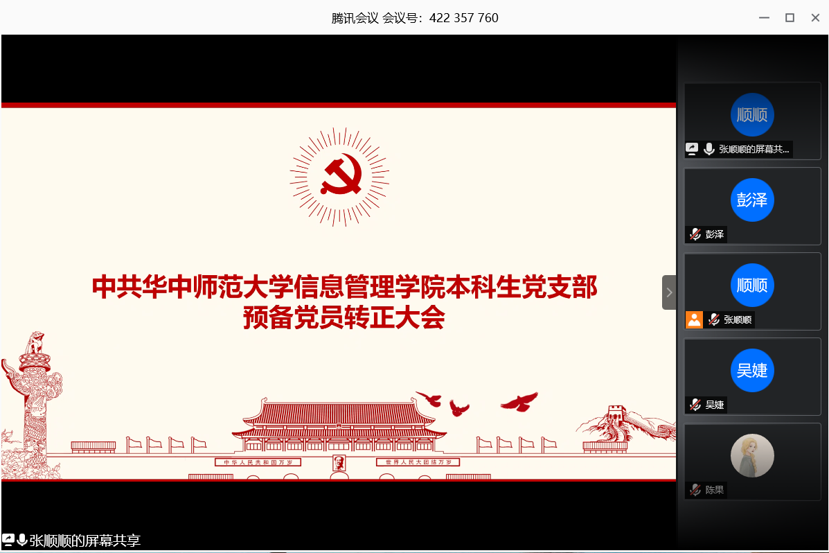 (通讯员 陈天雨 彭泽)2020年6月21日晚上七点,中共华中师范大学信息管理学院本科生党支部预备党员转正大会顺利召开。因疫情原因,本次会议采取腾讯会议的线上方式召开。本次大会到会成员为支部的8名正式党员、27名预备党员,大会由党支部副书记张顺顺同志主持。