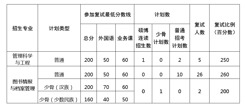 2、复试最低分数线、复试比例和各专业招生人数