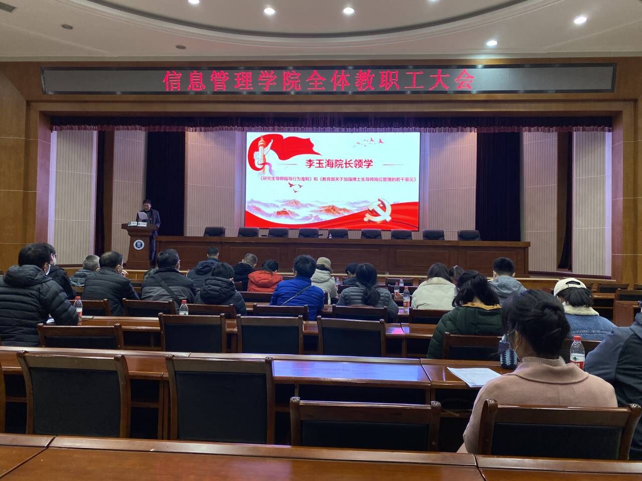(通讯员 蒋可鸣)12月4日下午,信息管理学院在科学会堂一楼报告厅召开教职工大会,会议由信息管理学院院长李玉海主持,信息管理学院全体教职工参加。会议主要对学院参加的第五轮学科评估工作进行部署、集体学习《研究生导师指导行为准则》和《教育部关于加强博士生导师岗位管理的若干意见》。