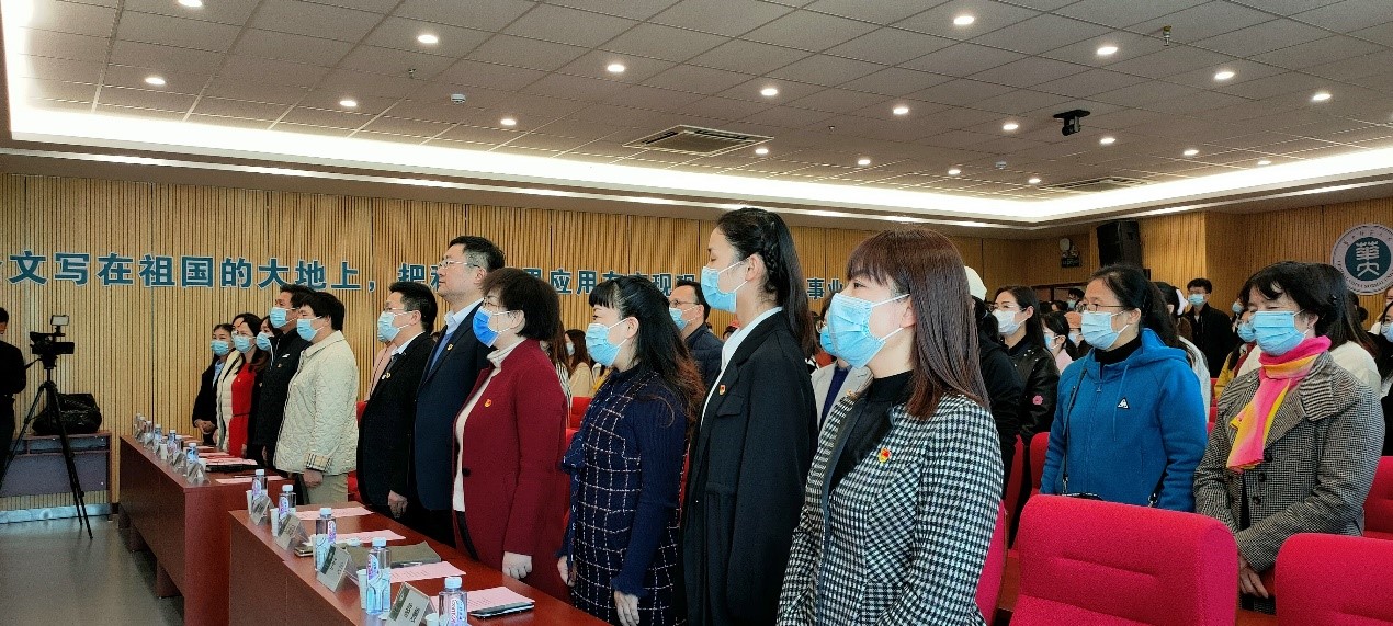 会议第一项,奏唱国歌。在庄严的国歌奏鸣声中,全体师生肃穆而立,充分展现了华中师范大学信息管理学院全体师生以及湖北省妇幼保健院产科专家们昂扬向上、拼搏进取的精神风貌。