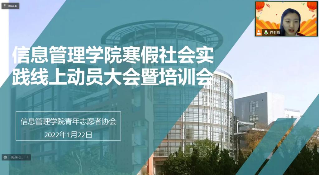 (通讯员 王卢 黄承轩)1月22日上午,为了让同学们更好地了解寒假社会实践内容,积极参与社会实践,信息管理学院举行寒假社会实践线上动员大会暨培训会。信管团委书记肖丽霞、青年志愿者协会负责人周艳主持。信管21级全体同学及18、19、20级同学参加会议。