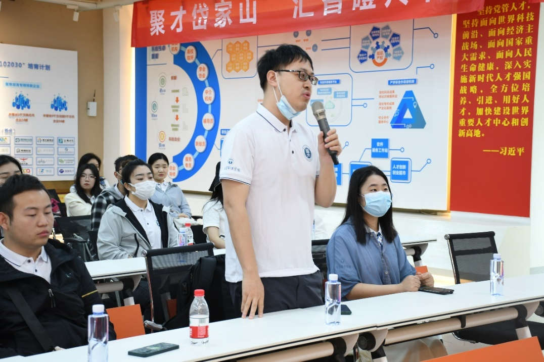 所有同学和老师落座后,工作人员详细介绍了岱家山科创城的创新创业孵化链条、运营模式、“校器企金介”对接机制和相关服务。为增强同学们对知识产权相关内容的了解,讲解员设置了答疑环节,老师和同学都积极参与,提出了科创城提供哪些知识产权服务、科创城支持大学生创业采取的机制和科创城如何了解企业需求等问题,讲解员耐心解答。