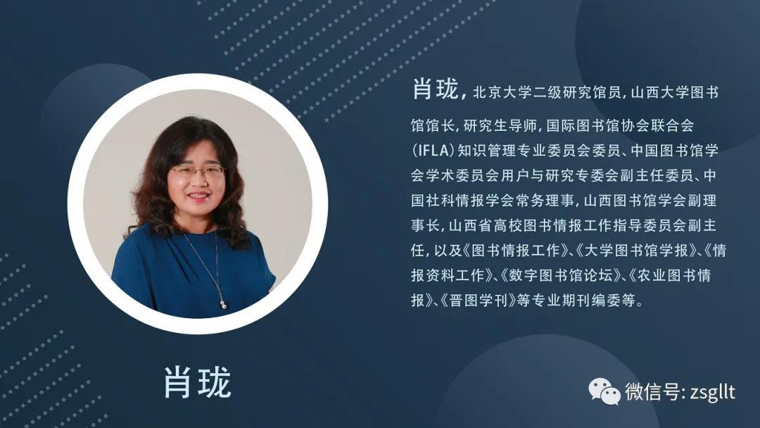 北京大学二级研究员、山西大学图书馆馆长肖珑研究员做了题为“国际图联知识管理专委会近年工作与知识管理未来思考”的报告。她首先介绍了国际图联知识管理专委会的基本情况,然后对2017-2019年知识管理专委会会议进行梳理,最后从业界的角度展望知识管理的未来发展。