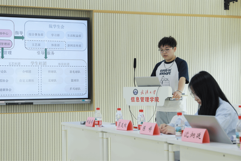 在与会人员自我介绍环节,大家热情洋溢,迅速拉近了彼此的距离。随后,武大信管团委学生会主席邱岳伟和华师信管团委学生会主席罗冰垚分别详细介绍了本学院团委学生会的基本架构及工作情况,让双方对彼此的组织体系和工作内容有了清晰了解。