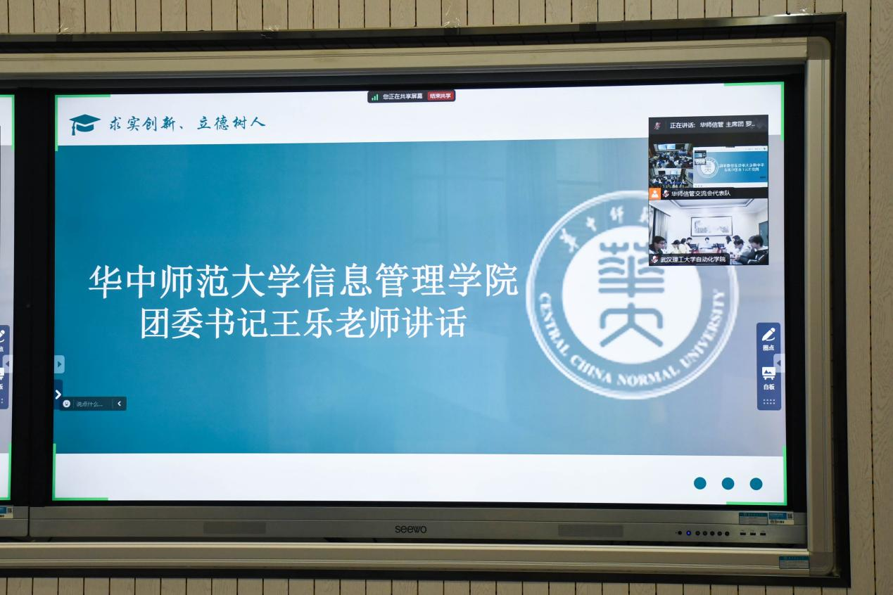 (通讯员 寇津赫 梅茹涵)为搭建两院跨校沟通桥梁、互相汲取学生工作经验,11月22日晚,“华师武理云际会,‘自’‘信’交融启慧思”华中师范大学信息管理学院团委学生会与武汉理工大学自动化学院团委学生会工作交流会于线上举行。两院团委学生会主席团和各部门代表参与本次交流,我院成员于南湖综合楼n110教室集中参会。华中师范大学信息管理学院团委书记王乐、武汉理工大学自动化学院团委书记彭文语出席了本次会议。交流会由2024级本科生钱诺成主持。
