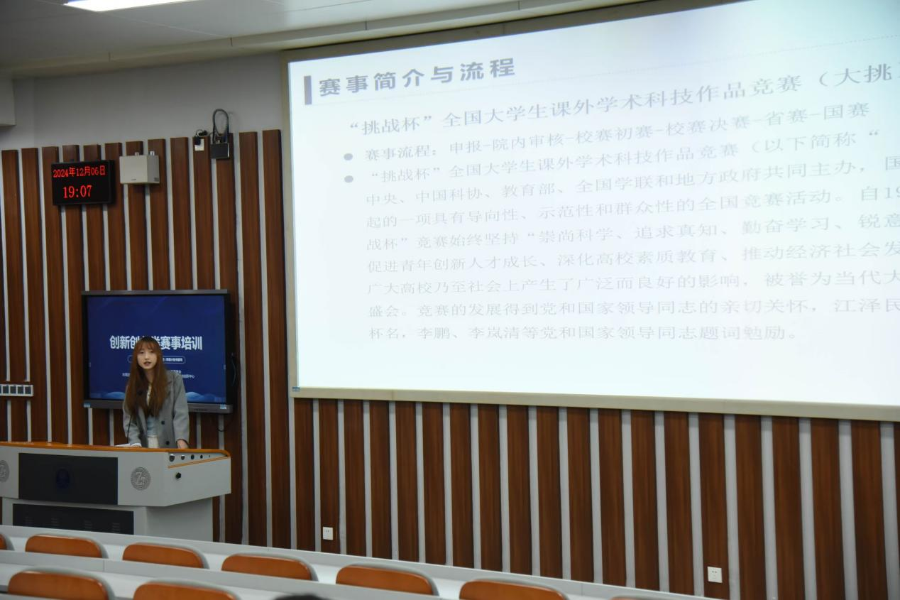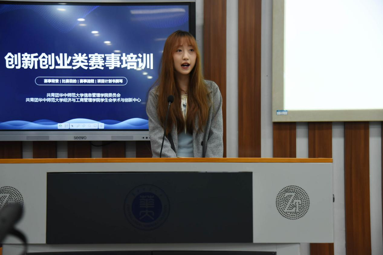会议伊始,张慕颖对到场的同学表示热烈欢迎,并简要介绍了研讨会的流程和目的。随后,研讨会进入了创新创业讲解培训环节。研讨会特别邀请创新创业经验丰富的2023级电子商务专业本科生苏婷展开分享,详细介绍各类创新创业赛事参赛流程和注意事项,并分享自己参与创新创业实践的心得。