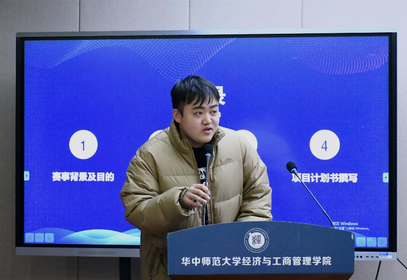 信息管理学院学创部分负责人吴嘉豪为同学们展开讲解,介绍赛事背景、比赛目的与意义,引导广大学生培养科学精神和科学态度,提升科创实践能力。他指出,创新创业的意义是帮助同学们提高综合素质,拓宽视野,将课本所学与实际应用结合,真正了解课上所学知识的实际意义,同时为国家社会发展贡献自己的力量。