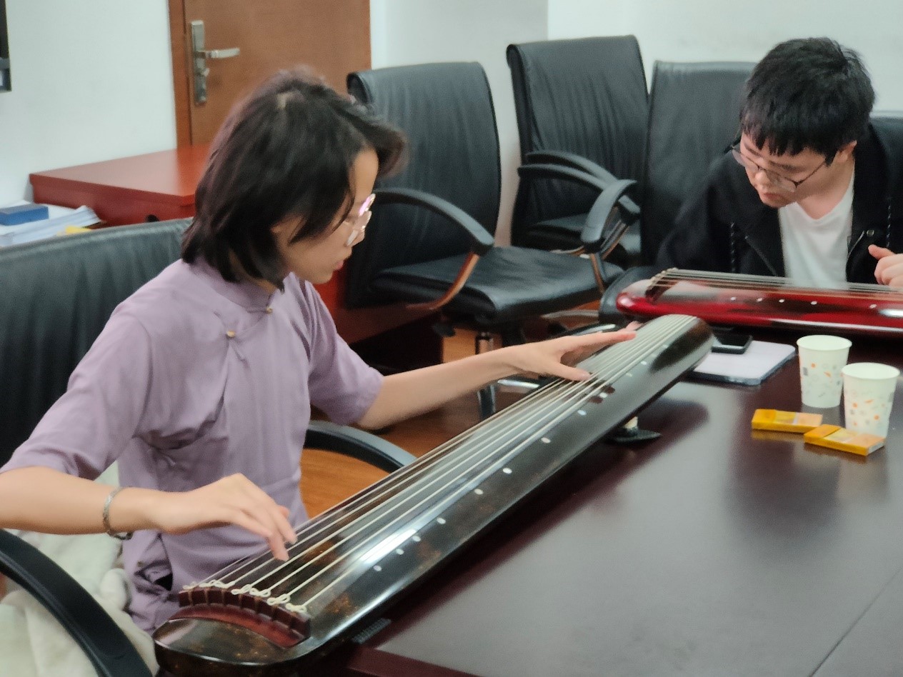 会议最后,丁钱铭及协会工作人员在现场对新生进行指法教导并让学员依次练习弹琴,学员间进行相互交流,经验分享。丁钱铭对新学员购琴意愿进行了解,并为学员提供有关琴的款式、种类的区分讲解,让学员对古琴的基础知识有了一定了解。