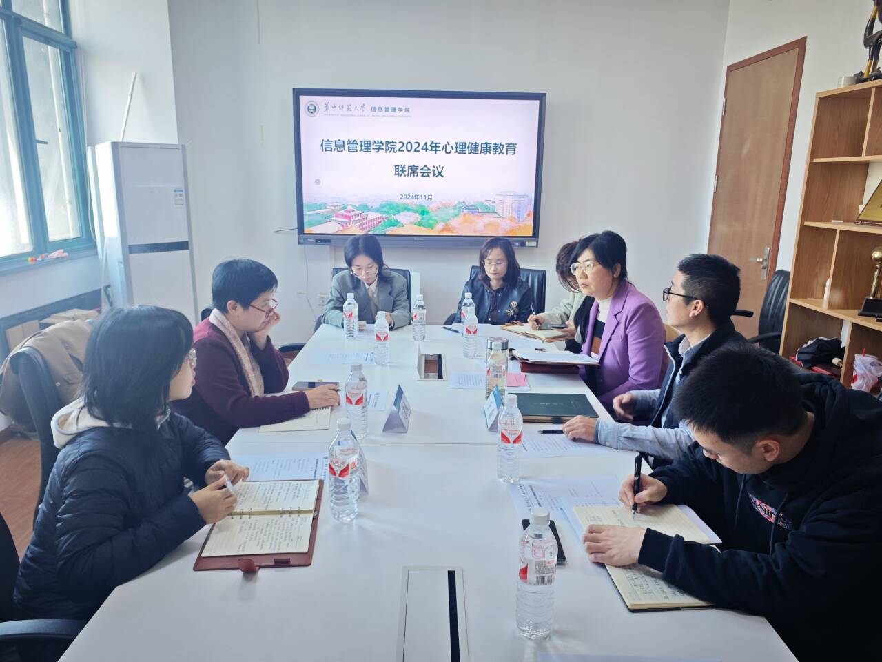 (通讯员 张巍瀚)11月21日下午,信息管理学院2024年心理健康教育联席会议在南湖综合楼10042会议室召开。学校党委学生工作部副处长吴建成,大学生心理健康教育中心指导老师袁丰卉,信息管理学院党委副书记王涛、学院本研全体专兼职辅导员以及班主任、导师代表参会。会议由信息管理学院党委副书记王涛主持。