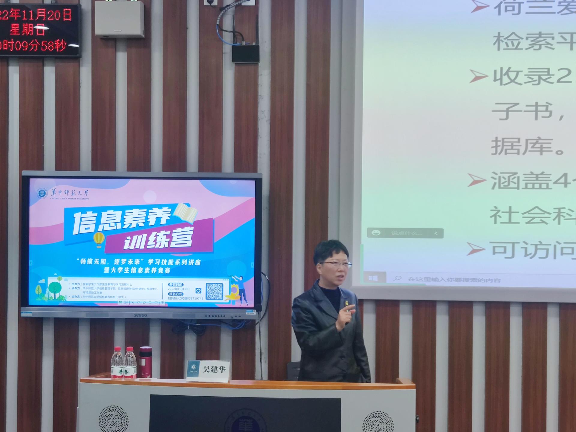 (通讯员 曹吉 周孟云)11月20日上午,由校党委学生工作部生涯教育与学习发展中心主办,信息管理学院承办的信息素养训练营第三期讲座于南湖综合楼N207教室举行,华中师范大学信息管理学院教授,图书馆学硕士生导师,情报学博士生导师——吴建华应邀作了题为“熟悉文献数据库,迅速定位目标文献”的讲座。