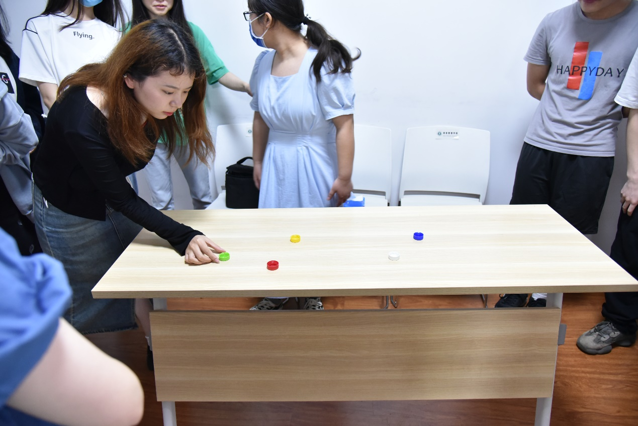 接下来是游戏环节。该环节包括三个小游戏,第一个小游戏是看图猜内容。主持人展示与童年经历相关的图片,大家根据提示信息猜出内容。同学们积极踊跃地举手抢答,开怀激动地大声作答,沉浸在喜悦气氛中。这一游戏唤醒了大家的童年记忆,在繁忙的生活中得到了返璞归真的机会,享受孩童般纯粹的快乐。第二个小游戏是根据描述词猜出具体人物。大家兴致勃勃地进行猜测,发现所展示的人物形象是大学两年来相遇的给予学生耐心教导的老师们,不禁欣喜雀跃。第三个小游戏是弹瓶盖大赛。大家自由分组进行比拼,拼尽全力让自己的瓶盖留在桌子上。在紧张刺激的游戏过程中,同学们都卸下了期末考试周的压力,尽情享受欢乐时光。