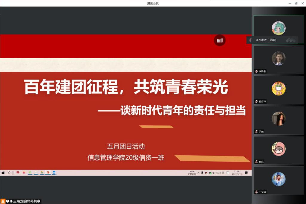 (通讯员 李昌柔)5月22日晚,信息管理学院信资2002团支部借助腾讯会议平台举行了以纪念建团百年为主题的五月团日活动。信资2002团支部全体成员参与活动,班长赵闺丽、团支书王海龙进行组织主持。同学们共同走进百年团史,追寻信仰之光,勇担青春使命,相互激励共同为实现青春梦想而奋斗。