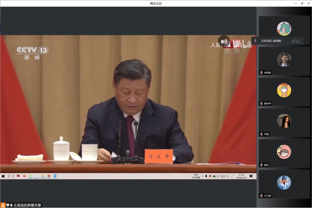 回顾历史环节结束后,支部成员们共同观看了庆祝中国共产主义青年团成立100周年大会视频,认真学习习近平总书记讲话精神。习近平总书记强调,青春孕育无限希望,青年创造美好明天。新时代的中国青年,生逢其时、重任在肩,施展才干的舞台无比广阔,实现梦想的前景无比光明。实现中国梦是一场历史接力赛,当代青年要在实现民族复兴的赛道上奋勇争先。广大团员青年要努力成长为有理想、敢担当、能吃苦、肯奋斗的新时代好青年,用青春的能动力和创造力激荡起民族复兴的澎湃春潮,用青春的智慧和汗水打拼出一个更加美好的中国。