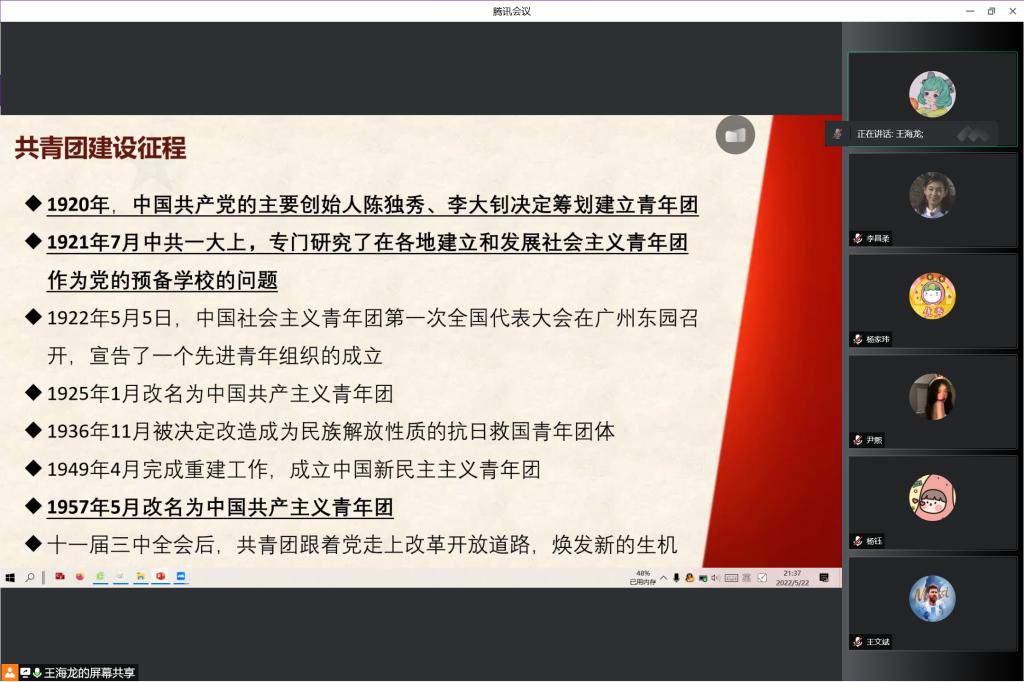 最后是感悟交流环节。尹熙同学和张紫茀同学分别向大家分享了自己听讲和观看相关视频之后的感受。尹熙感叹在团的百年征程中,青年始终与国家同频共振:民族危难之际,他们冲锋陷阵,砸碎旧世界,热血燃光明;建设新中国时期,他们勇挑重担,怀赤子之心,建雄伟大厦。而张紫茀则想到了在前不久结束的北京冬奥会上,中国体育健儿奋勇拼搏,迎难而上,创造了中国冬奥的最佳战绩。青年勇敢、坚强、果决的精神面貌,是对建团百年最好的礼赞。