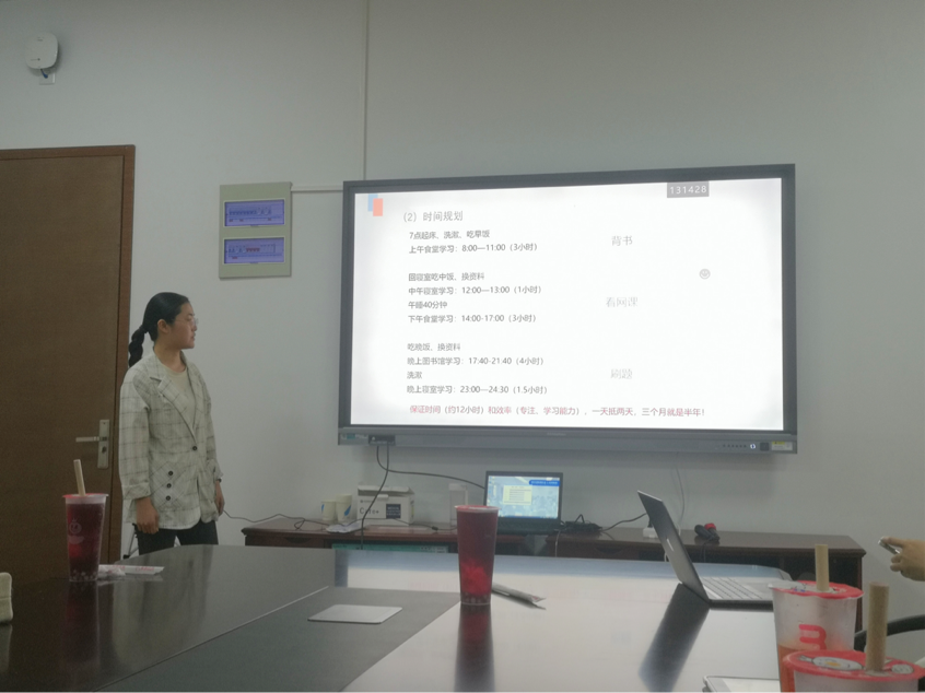 分享会正式开始,首先分享的是余丽霞。她是18级电子商务专业学生,在仅仅三个月的考研复习之后以专业排名第三十的成绩考入南京大学的图书情报专硕。在谈论考研心得时,余丽霞重点分享了自己的考研复习时间规划,由于是从9月份才开始准备,她深知时间的紧张,从早上7点起床开始,除了吃饭午休分秒必争,一直学习到凌晨。她提到,为了提高学习效率,要制定好每周的规划、高度自律、时常交流反馈,既然时间不如别人宽裕,那就加倍专注,一天抵两天!在最后总结经验时,余丽霞建议同学们要认清自己到底是适合读研还是就业,不要盲目跟随大流,在做好考研的决定之后,就要早做准备。