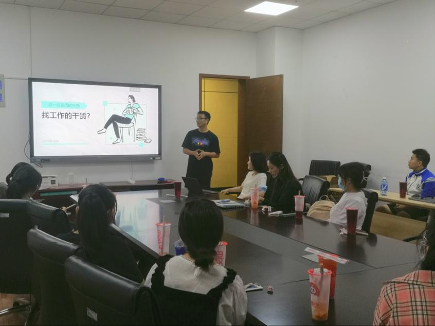 第三个是李淼为同学们进行就业经验分享。他在大三时改变了自己一直以来考研的目标,找准了适合自己的人生方向,然后积极寻求实习机会,目前拿到了斗鱼直播的实习offer,找到了适合自己的岗位。他的分享从介绍自己的求职经历入手,建议同学们首先分析清楚自己的优势和劣势,对自己的优势进行包装。接着对大家在寻找实习机会时常有的困惑提出建议—没有实习经历就去找小厂包装,增长经验;不擅长沟通表达,抓住当众说话的机会训练自己的逻辑表达。然后就简历制作和笔试面试两个关键环节进行具体的分析和介绍,干货满满,同学们热情高涨,积极提问,现场气氛十分活跃。