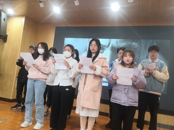 活动伊始,由管工二班团支书李久肖主持发言,介绍活动大致流程,并宣布第一个诗歌朗诵环节的正式开始。活动开始前就已分好组的七组成员分别以视频或现场展示的方式进行辛亥革命主题诗歌朗诵比赛。无论是现场朗诵还是视频播放,每组成员的诗歌朗诵都激情澎湃,富有感情。朗诵环节结束后,由每班团支书在班级群发起投票,决选出最喜欢的小组朗诵,并颁发奖品。
