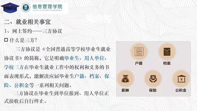 会议第二项,由王妞妞老师讲解毕业、就业的相关工作。王妞妞老师先是对毕业论文相关事宜进行说明,提醒毕业生密切关注本学期的时间安排变动,在规定期限内完成相应任务。接着,强调了学位论文盲审工作和复制比检测工作,希望毕业生予以高度重视。对于就业事宜,王妞妞老师详细介绍了网上签约和户档派遣问题,以切实保障应届生权益,同时鼓励大家敢于尝试,找到适合自己的职业与工作。