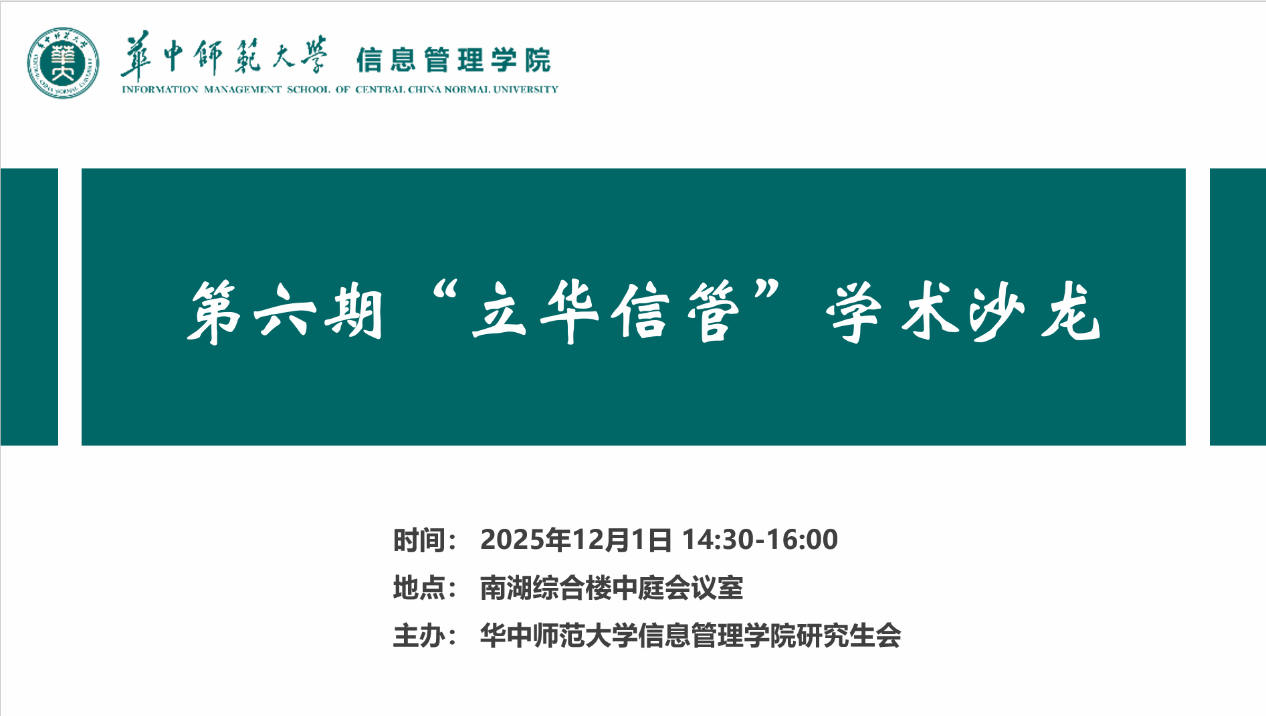 (通讯员 李佳怡 陈润凡 车昀泽)为进一步提升研究生培养质量,促进学术交流与协作,营造良好学术氛围,12月1日下午,信息管理学院第六期“立华信管”学术沙龙在南湖综合楼10楼中庭会议室成功举办。信息管理学院叶光辉教授、曾粤亮副教授、博士研究生刘劲等参与学术沙龙,院研究生会孙宇佳主持活动。