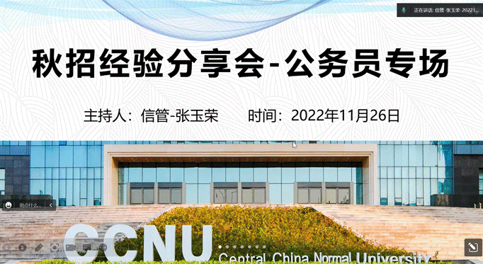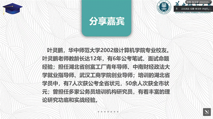 为帮助同学们在即将到来的公务员考试中取得更为理想的成绩,由华中师范大学校研究生会主办、公共管理学院承办、信息管理学院协办的秋招经验分享会——公务员专场于2022年11月26日晚19:00在线上举办。本次分享会由来自灵鹏教育的2002级校友叶灵鹏老师、2019级管理科学与工程专业硕士研究生刘曜嘉同学担任主讲人,信息管理学院张玉荣同学担任主持人,参与活动的有来自各学院的150多名同学。