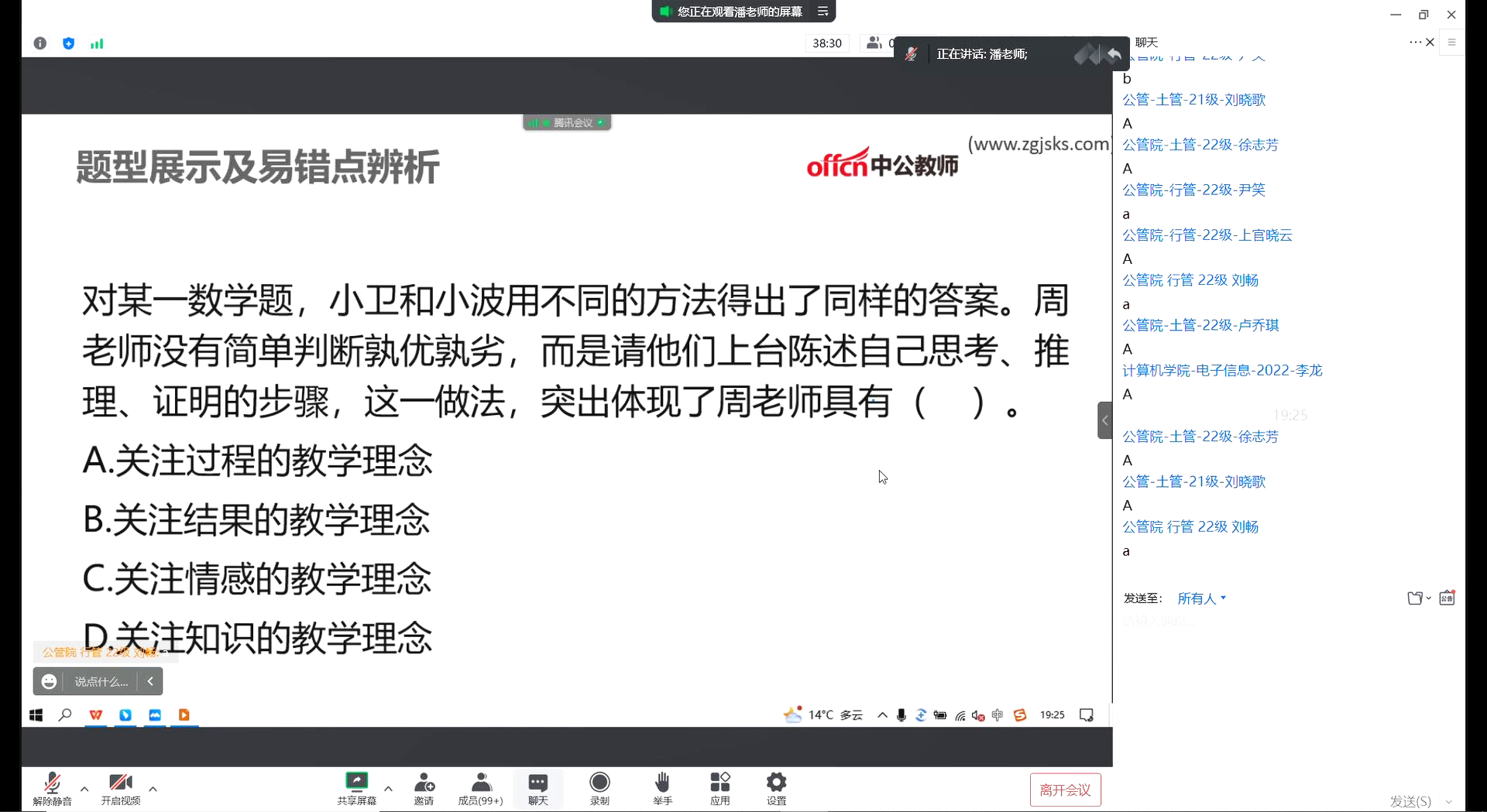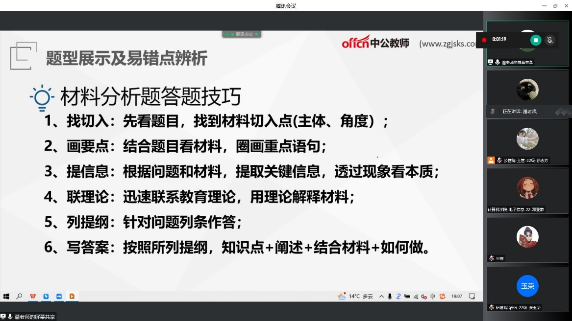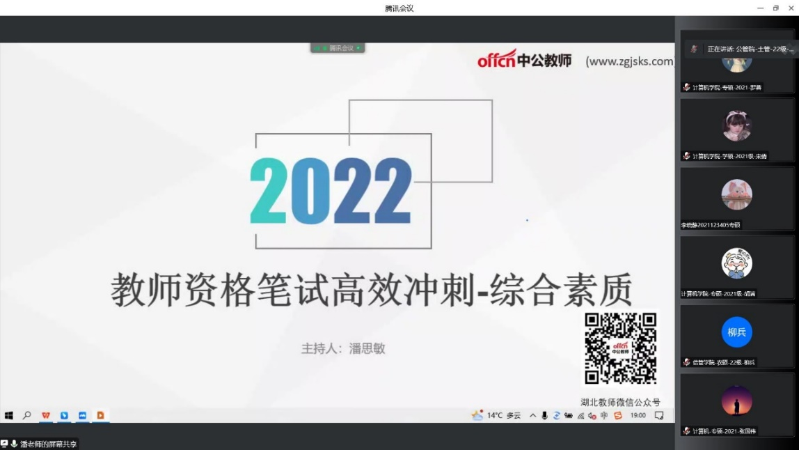 为助力同学们的教师资格考试笔试备考,由信息管理学院和公共管理学院主办、计算机学院和人工智能教育学院共同承办的2022教资笔试冲刺讲座于10月26日晚19:00在线上举办。本次讲座由来自湖北中公教育的潘思敏老师担任主讲人,公共管理学院研究生会徐志芳担任主持人,参与活动的有来自各学院的近200名同学。
