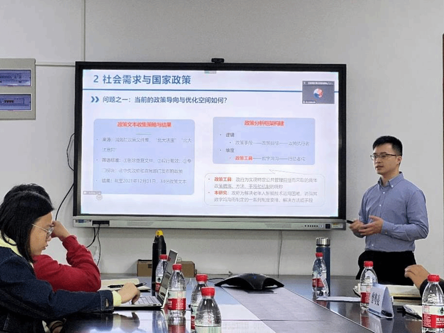 首先,青年教师曾粤亮老师向大家分享了以“社会支持视角下老年人数字素养提升路径及公共图书馆角色”为主题的研究,曾老师先以自身学术研究背景和当前研究视角为出发点,向大家阐述了选定该研究方向的缘由。随后,曾老师分别分析了当前研究问题的政策导向与优化空间、老年人数字素养的提升方式及挑战以及年轻一代大学生如何通过志愿服务提升老年人数字素养。接着,曾老师回归公共图书馆角色并提出该角色助力老年人数字素养提升的多种途径。最后,曾老师针对问题的发现及理论与方法的应用两方面向大家分享了个人体会,并对现场同学的提问一一进行耐心解答,与会人员受益颇多。