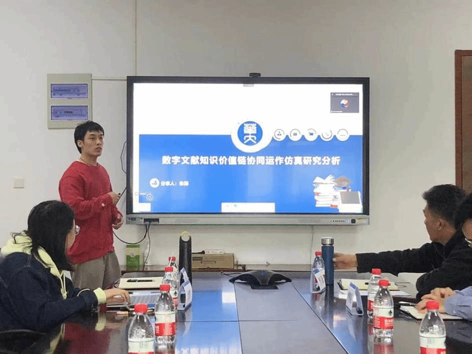 接着,博士生朱泽向大家分享了以“数字文献知识价值链协同运作仿真研究分析”为题的研究,朱泽同学首先向大家介绍了当前针对我国文献信息资源保障主体研究的相关背景,阐述了研究主题的价值与意义。随后,朱泽同学从我国数字文献资源价值链中的主体形象、主体的价值链因果关系和数字文献资源主体的行为逻辑三个方面展开介绍,明晰了当前主题的研究内容与分析途径,并得出相关研究结论。最后,朱泽同学结合自身的学习研究情况,向大家分享较好的制图技能与制图逻辑在科研进程中的助推作用。