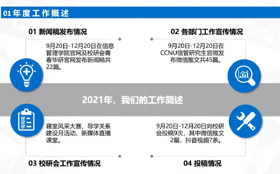 (通讯员 邓佳敏)为持续高效开展研究生会工作,总结前一阶段工作成果与经验教训,进一步明确今后工作目标,更好地完成工作任务,增强全体干部对研究生会的归属感,信息管理学院研究生会于2022年1月14日下午3:00在腾讯会议进行了第十八届研究生会团总支期末总结大会。本次会议由我院研究生会主席王丽娜主持,信息管理学院研究生会指导老师叶孔森老师、李静老师出席会议,全体研会干部参与会议。