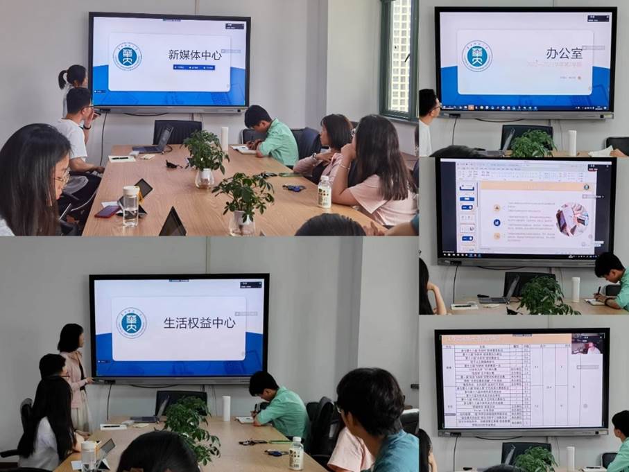 办公室成员陈心仪介绍了办公室的报销完成度,日常事务内容以及组织育人系列活动开展情况。学术发展中心成员朱晓君讲述了学术与职业发展活动的特色与内容,回顾了本学期举办的各类活动并进行总结。新媒体中心成员陈静展示了新媒体中心在校研会平台的投稿和活动宣传情况,用发文量、关注人数、阅读量等数据全方位展现院官方微信公众号的运营情况,针对目前的不足之处提出改进方法。生活权益中心负责人郑潇潇阐述了部门的校级活动配合、调研和活动开展情况,分享了自己在学生工作中的心得感悟并拟定下一步的工作计划。文体体育中心负责人黄奇峰介绍了文艺和体育活动的工作完成情况,展示了校级、跨院、院级活动的精彩照片,细致分析了目前的短板并规划努力方向。
