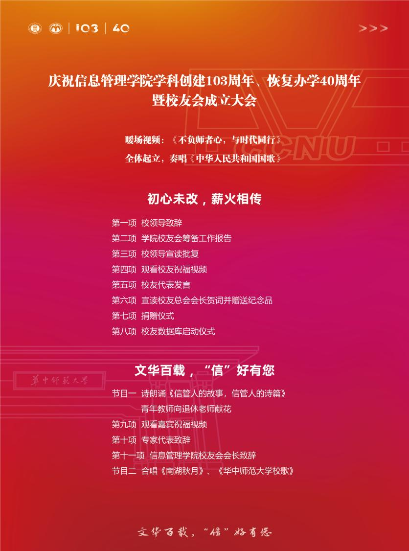“庆祝信息管理学院学科创建103周年、恢复办学40周年暨校友会成立大会”将于 2023年5月2日(周二)在华中师范大学佑铭体育馆举办。佳期将至,诚邀各位校友和嘉宾相聚桂子山,见证历史性时刻。