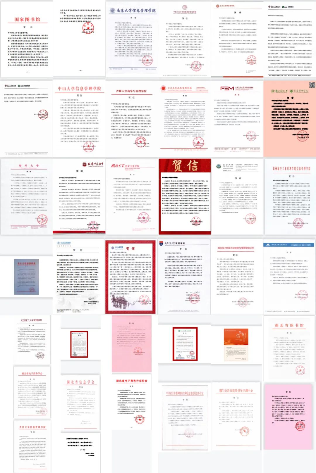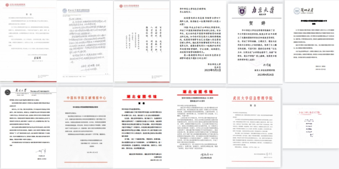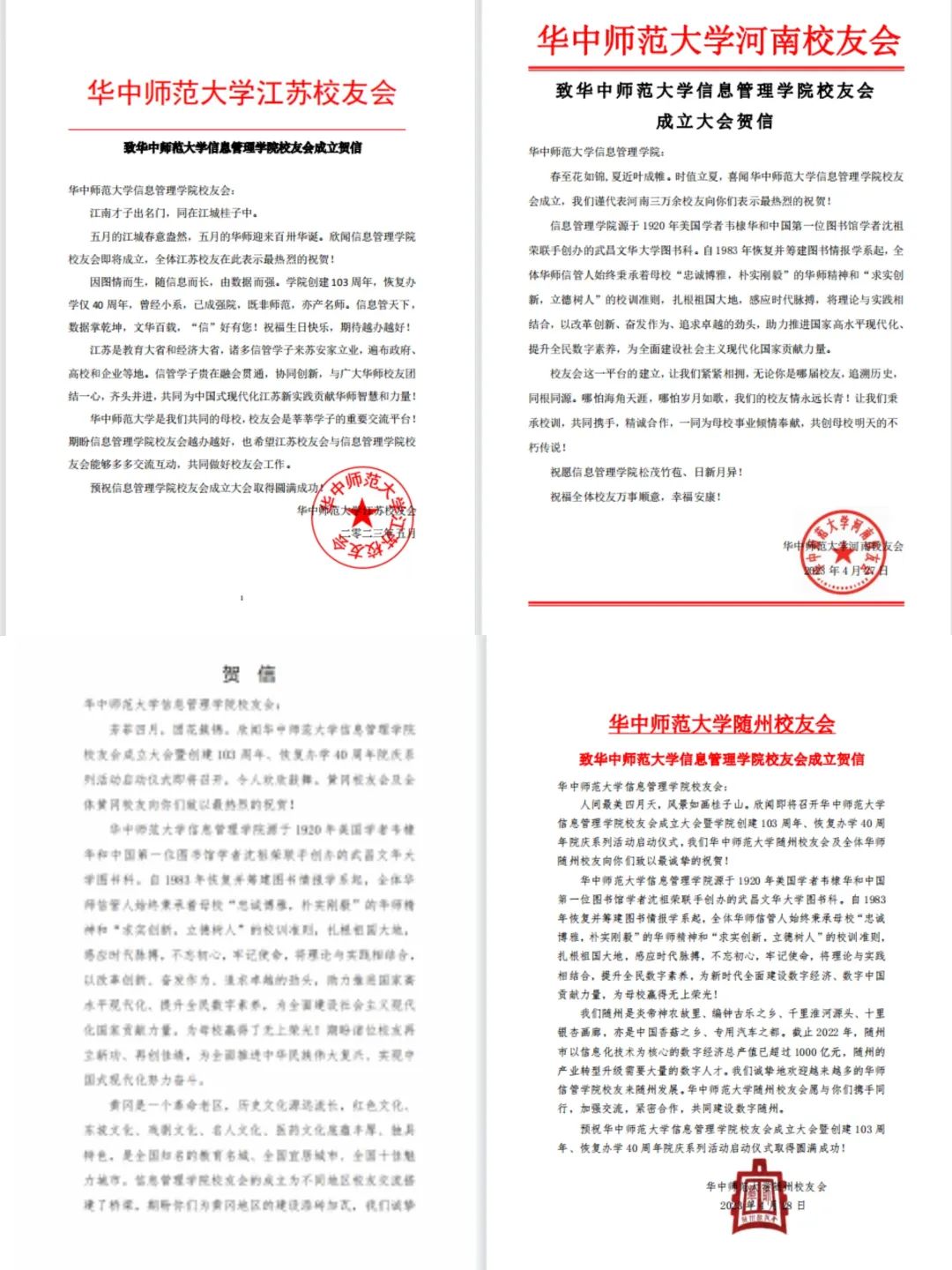 本次大会还收到国家图书馆、北京大学、武汉大学、中国人民大学、南京大学、南开大学、中山大学、吉林大学、华中科技大学、四川大学、西安交通大学、厦门大学、华东师范大学、合肥工业大学、湖北省图书馆、湖北省科技信息研究院、湖北省电子商务行业协会等50余家友好单位和兄弟高校以及地方校友会的贺信贺电。